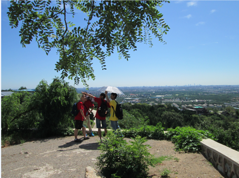 【北京西山国家森林公园某山顶,我们的探路先锋遥指远方,辽阔蓝天、宏伟北京城做背景,更显青春豪迈气概】【“生态文明,西山追梦”张冬平 经贸院